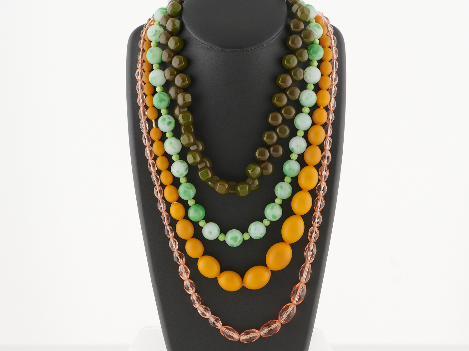 A COLLECTION OF VINTAGE NECKLACES INCLUDING BAKELITE AND GLASS