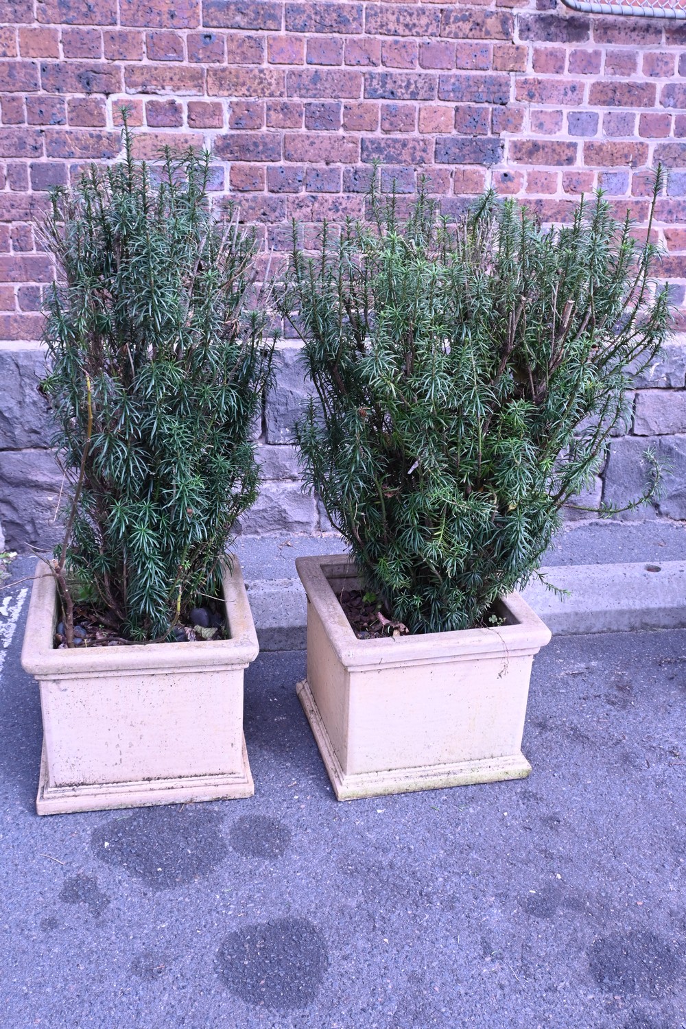 A PAIR OF CONCRETE PLANTERS WITH PLANTS (A/F) (H142 X W48 X D48 CM) (PLEASE NOTE THIS HEAVY ITEM MUST BE REMOVED BY CLIENTS OR CARRIERS AT THE CUSTOMERS EXPENSE. LEONARD JOEL STAFF CANNOT ASSIST CARRYING THIS ITEM)
