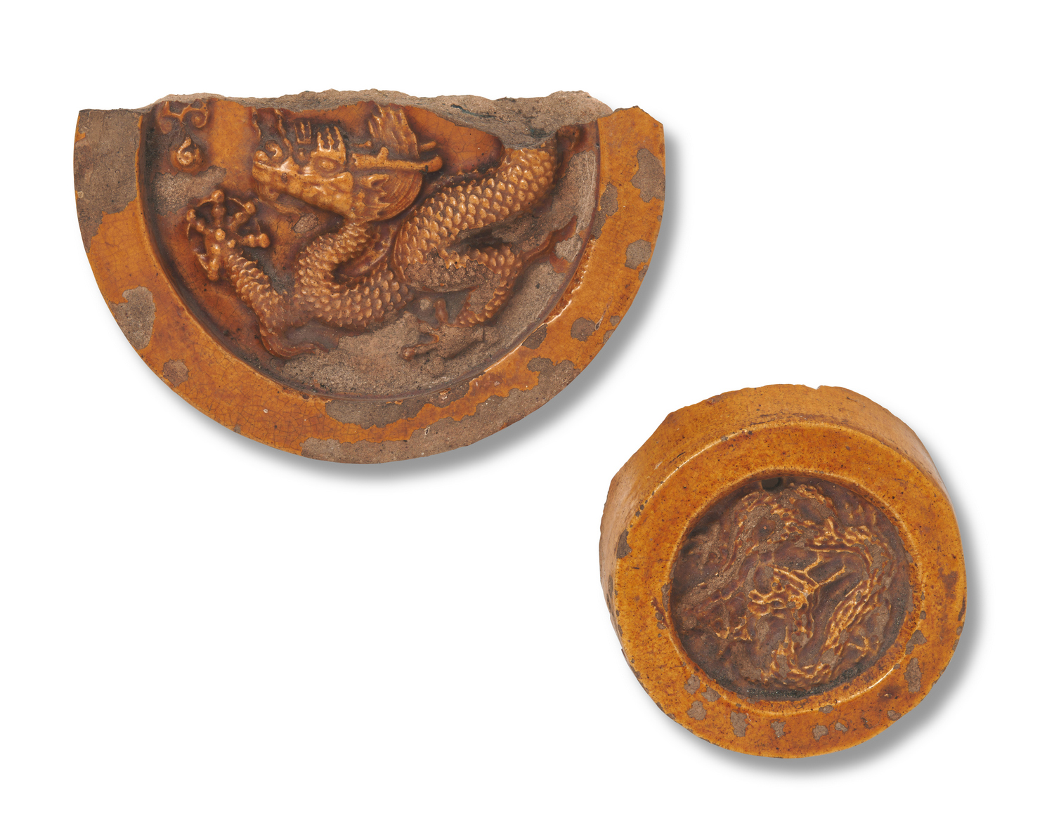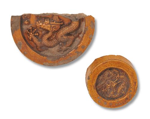 One small roof end and a larger fragmentary roof end, both with relief moulding of five-clawed Imperial dragons. Both set into an old display board.
