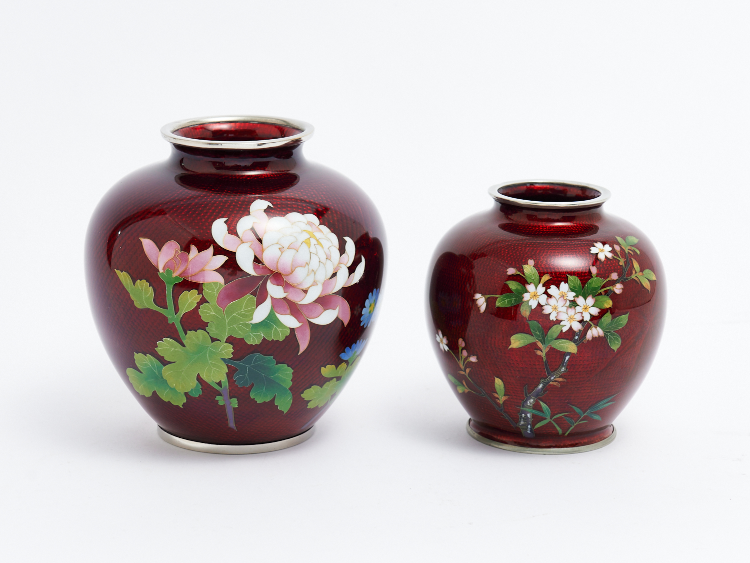 TWO JAPANESE GINBARI CLOISONNE VASES, SMALLEST WITH SATO HALLMARKS TO BASE H.15.5CM (LARGEST), LEONARD JOEL LOCAL DELIVERY: SMALL
