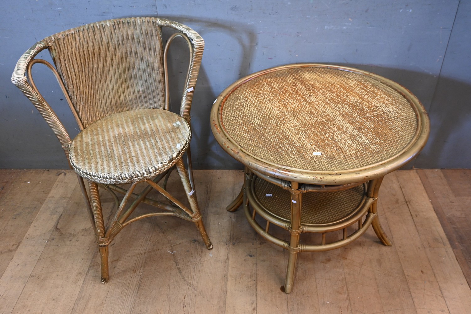 A VINTAGE GILT EFFECT BAMBOO AND CANE TWO TIER CIRCULAR TABLE WITH LOUNGE CHAIR ( A/F) ( 58H X 71 DIMAETER CM) (LEONARD JOEL DELIVERY SIZE: LARGE)