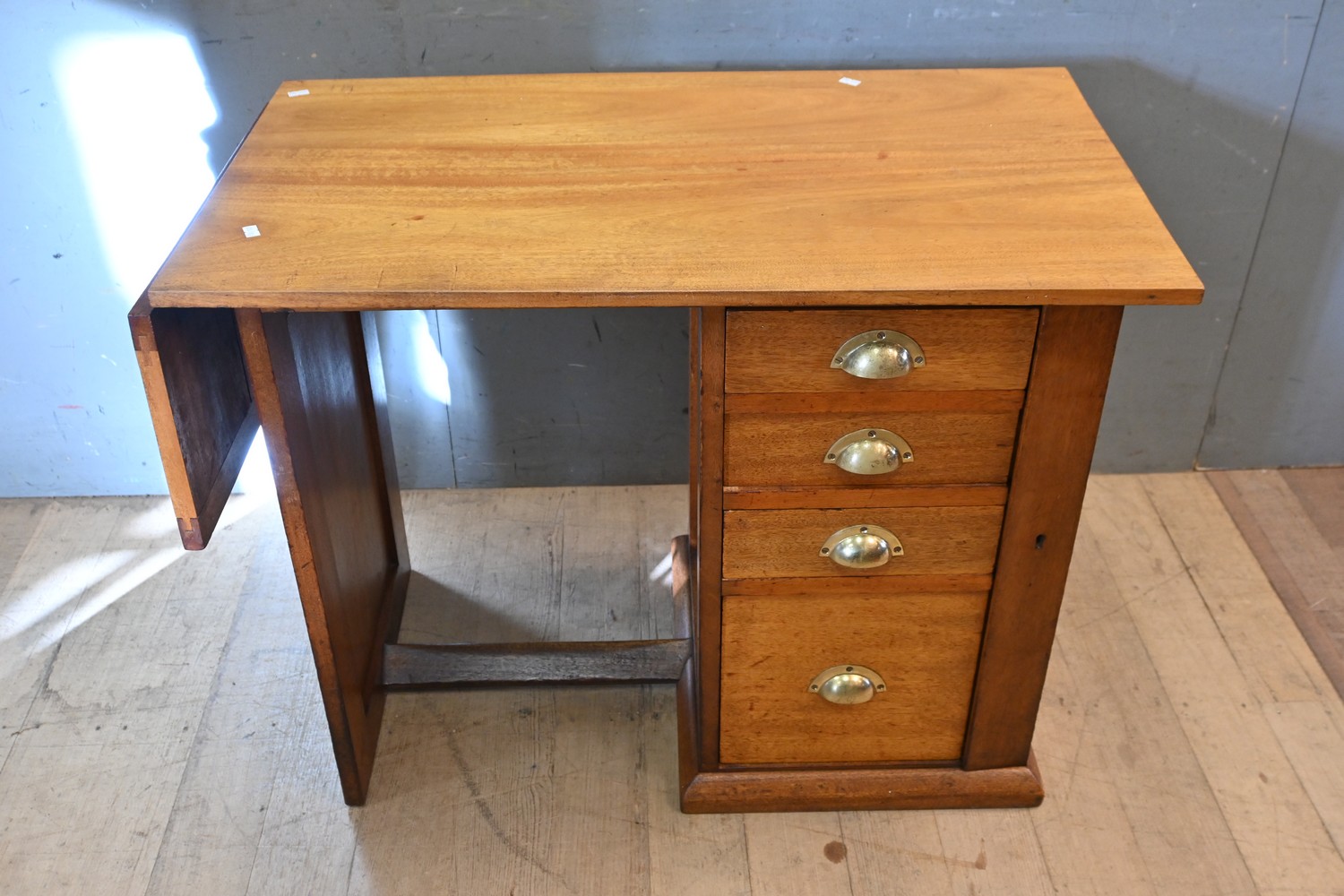 A1920S ENGLISH OAK FOUR DRAWER DROP SIDE DESK WITH WELLINGTON LOCKING MECHANISM (A/F) ( NO KEY ) ( 70H X 90W X 50D CM) (LEONARD JOEL DELIVERY SIZE: X-LARGE)