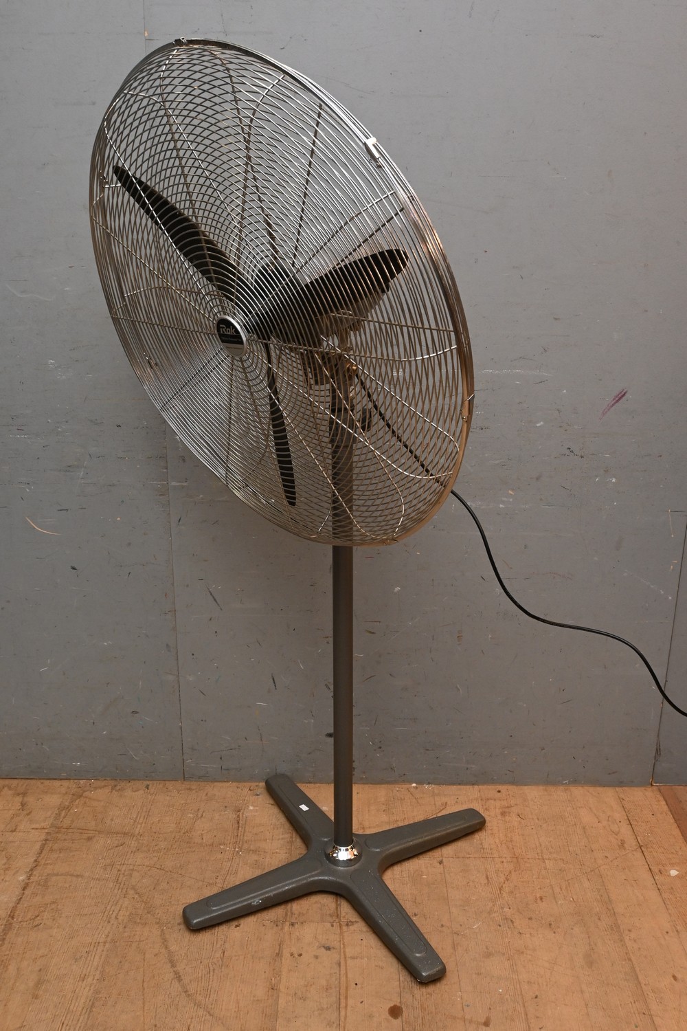 A LARGE INDUSTRIAL CAST-IRON AND CHROMED PEDESTAL FAN (151H CM) (PLEASE NOTE THIS HEAVY ITEM MUST BE REMOVED BY CLIENTS OR CARRIERS AT THE CUSTOMERS EXPENSE. LEONARD JOEL STAFF CANNOT ASSIST CARRYING THIS ITEM)