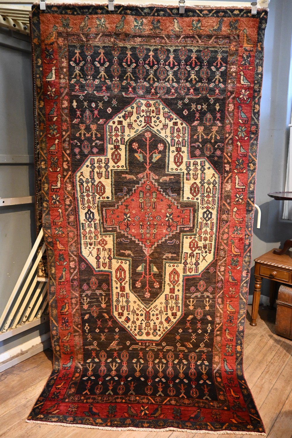 A HAND-KNOTTED PERSIAN SENNEH RUG, 100% WOOL, NATURAL DYES. VILLAGE WEAVE FROM THE KURDISTAN REGION WITH TRIBAL DESIGN OF DOUBLE MEDALLIONS IN A PRIMARY CHARCOAL-TONED FIELD OF TREE OF LIFE DESIGNS AND SECONDARY FIELD OF TRIBAL MOTIFS. BORDER OF ROSETTES AND BIRD MOTIFS ON A POMEGRANATE FIELD. SIZE: 307 X 140 CM ORIGIN: IRAN - RRP: $2,900 DOCUMENTATION OF AUTHENTICITY INCLUDED.