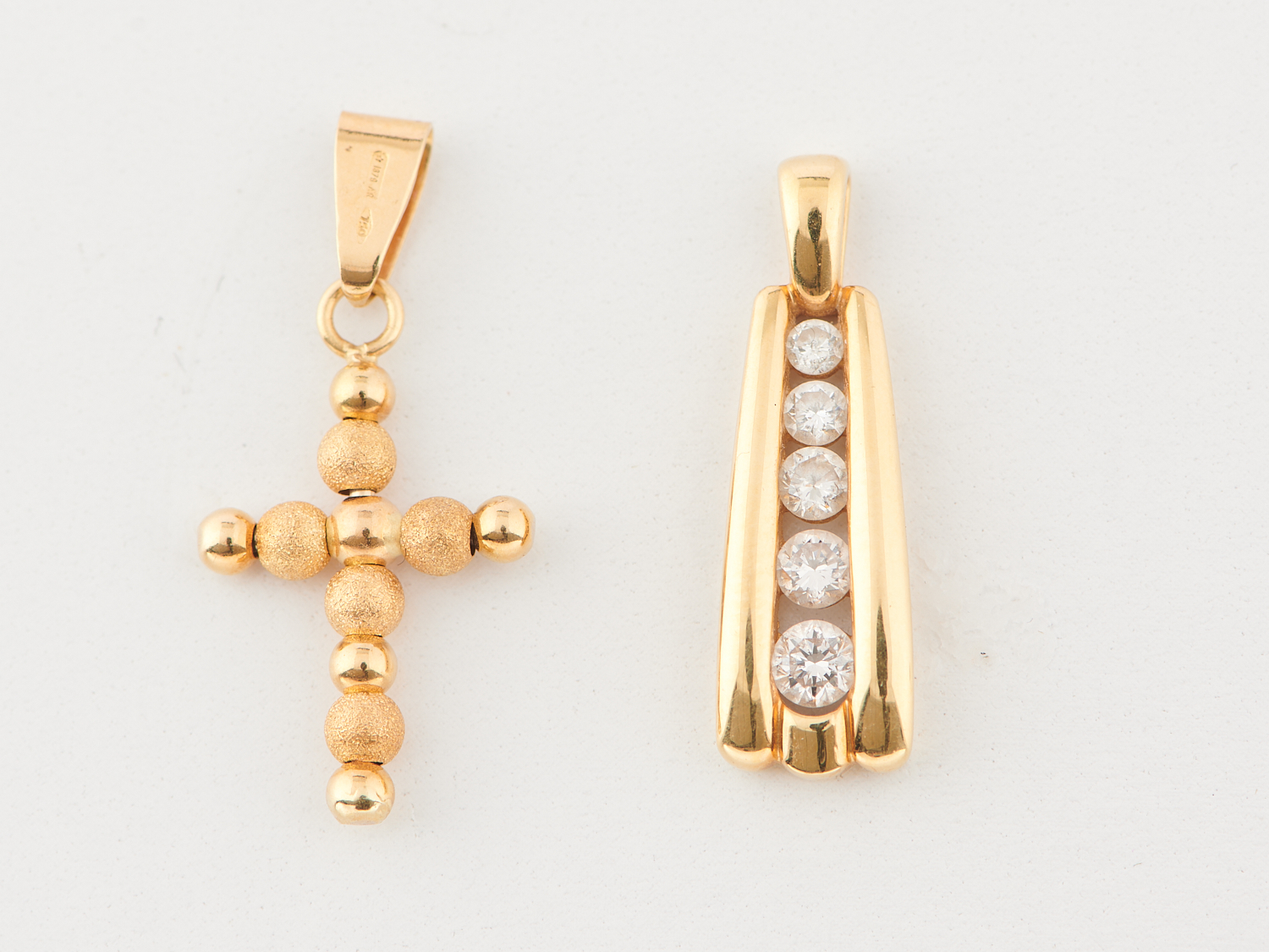 TWO PENDANTS IN 18CT GOLD, ONE DIAMOND SET (APPROX. 0.35CTS), 4.15GMS
