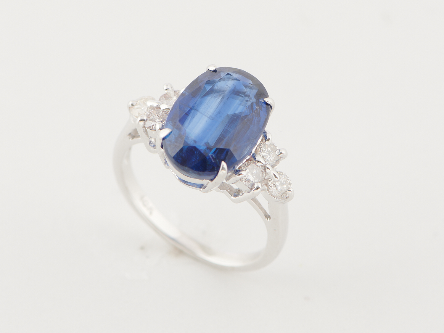 A BLUE KYANITE AND DIAMOND RING IN 18CT WHITE GOLD, THE KYANITE TOTALLING APPROXIMATELY 7CTS, THE DIAMONDS TOTALLING APPROXIMATELY 0.75CTS, RING SIZE O, WEIGHT 4.7CTS