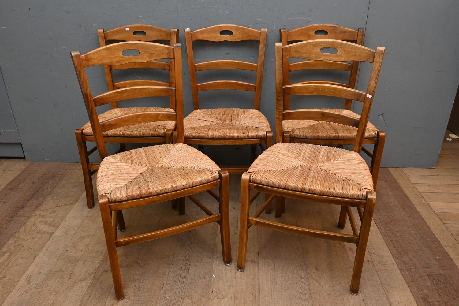 A SET OF FIVE LADDERBACK DINING CHAIRS WITH RUSH SEATS (A/F) (95H X 53W X 53D CM) (LEONARD JOEL DELIVERY SIZE: LARGE)