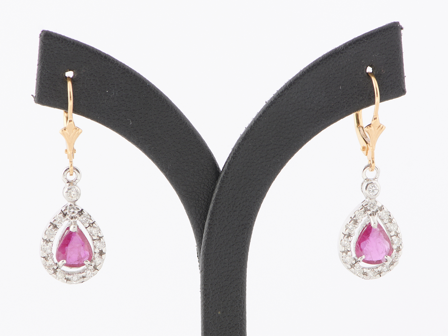 A PAIR OF RUBY AND DIAMOND EARRINGS IN 18CT TWO TONE GOLD, TO EUROPEAN HOOK FITTINGS, THE RUBIES TOTALLING APPROXIMATELY1.70CTS, THE DIAMONDS TOTALLING APPROXIMATELY 0.65CTS, APPROXIMATE SIZE 10 X 33MM, APPROXIMATE WEIGHT 4.52GMS