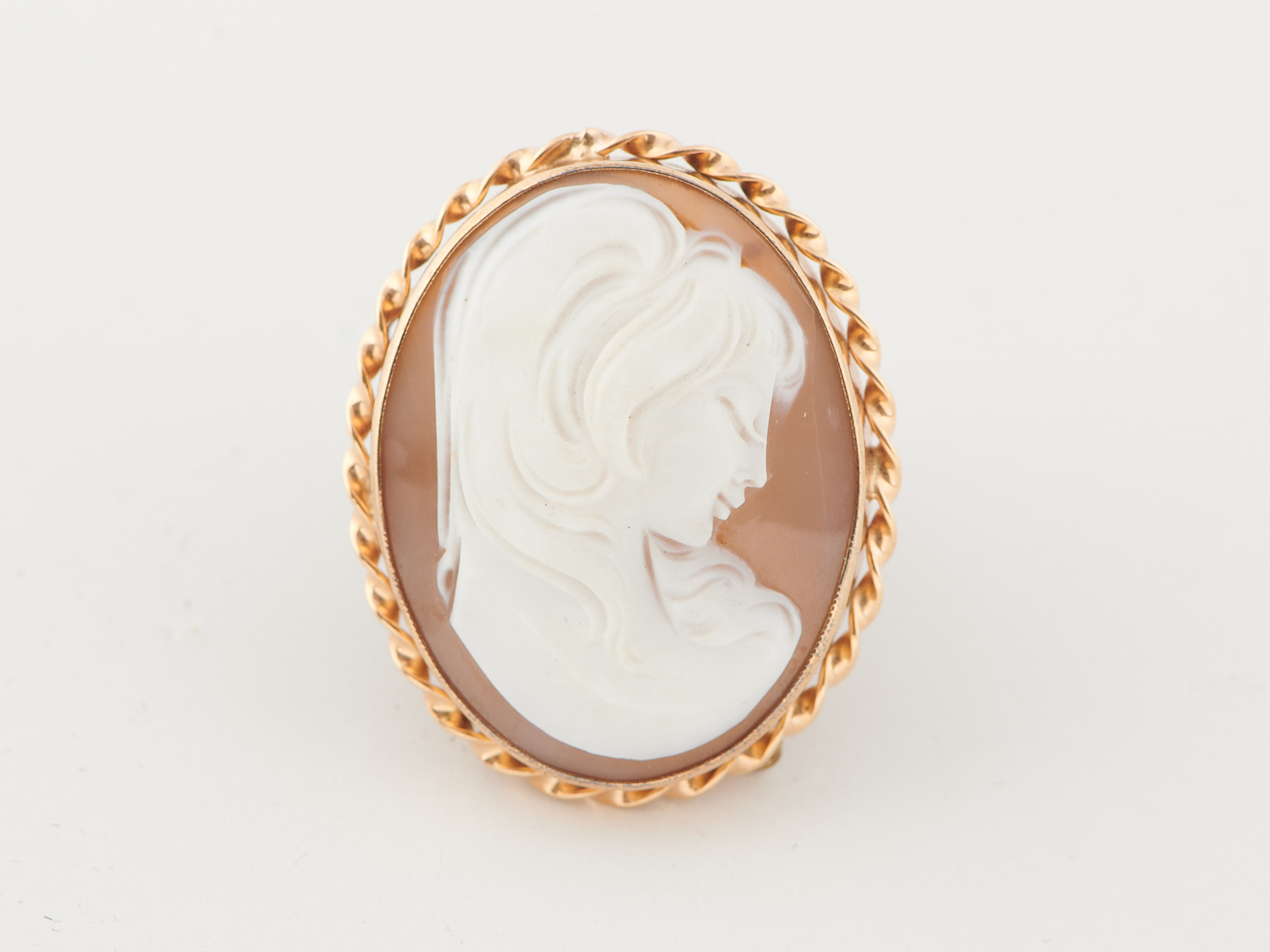 A CAMEO BROOCH IN 9CT GOLD (SAFETY CHAIN AND PIN IN BASE METAL), SIZE 40 X 32MM, WEIGHT 9.28GMS