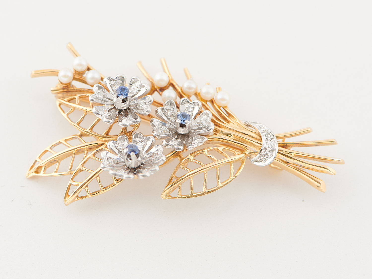A DIAMOND, SAPPHIRE AND SEED PEARL BROOCH IN 18CT GOLD, THE BROOCH MEASURING APPROXIMATELY 57 X 30MM, TOTAL WEIGHT APPROXIMATELY 16.49GMS