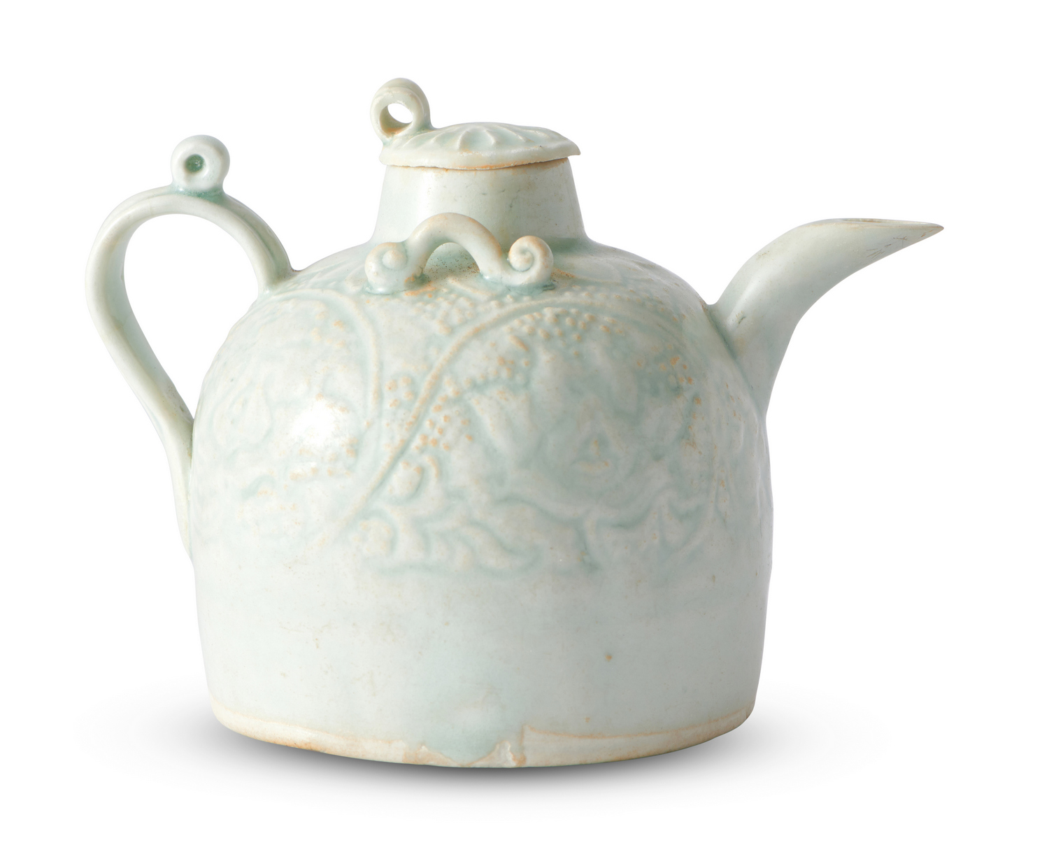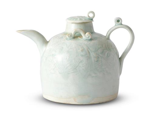 Of hemispherical form with a gently curved handle and spout, and lug handles to the shoulder. The surface with moulded decoration of scrolling lotus.
