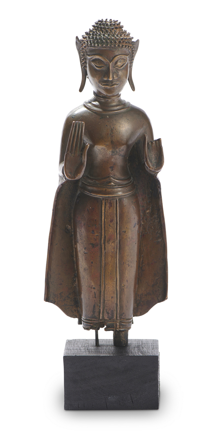 Buddha Sakyamuni standing in samabhanga, both hands in abhayamudra, wearing a cloak, his face with serene expression. Mounted on a wooden base.