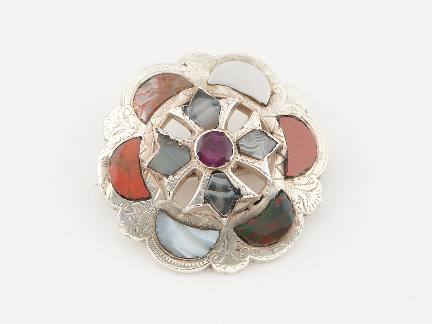 A VICTORIAN STERLING SILVER AND AGATE BROOCH SET WITH A GARNET, APPROXIMATE DIAMETER 44MM, APPROXIMATE WEIGHT 12.15GMS
