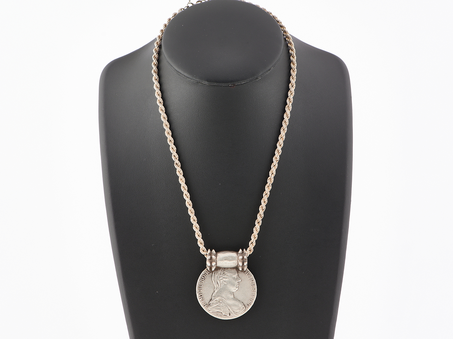 AN AUSTRO HUNGARIAN COIN PENDANT, DATED 1780, TO A ROPE CHAIN IN CONTINENTAL SILVER