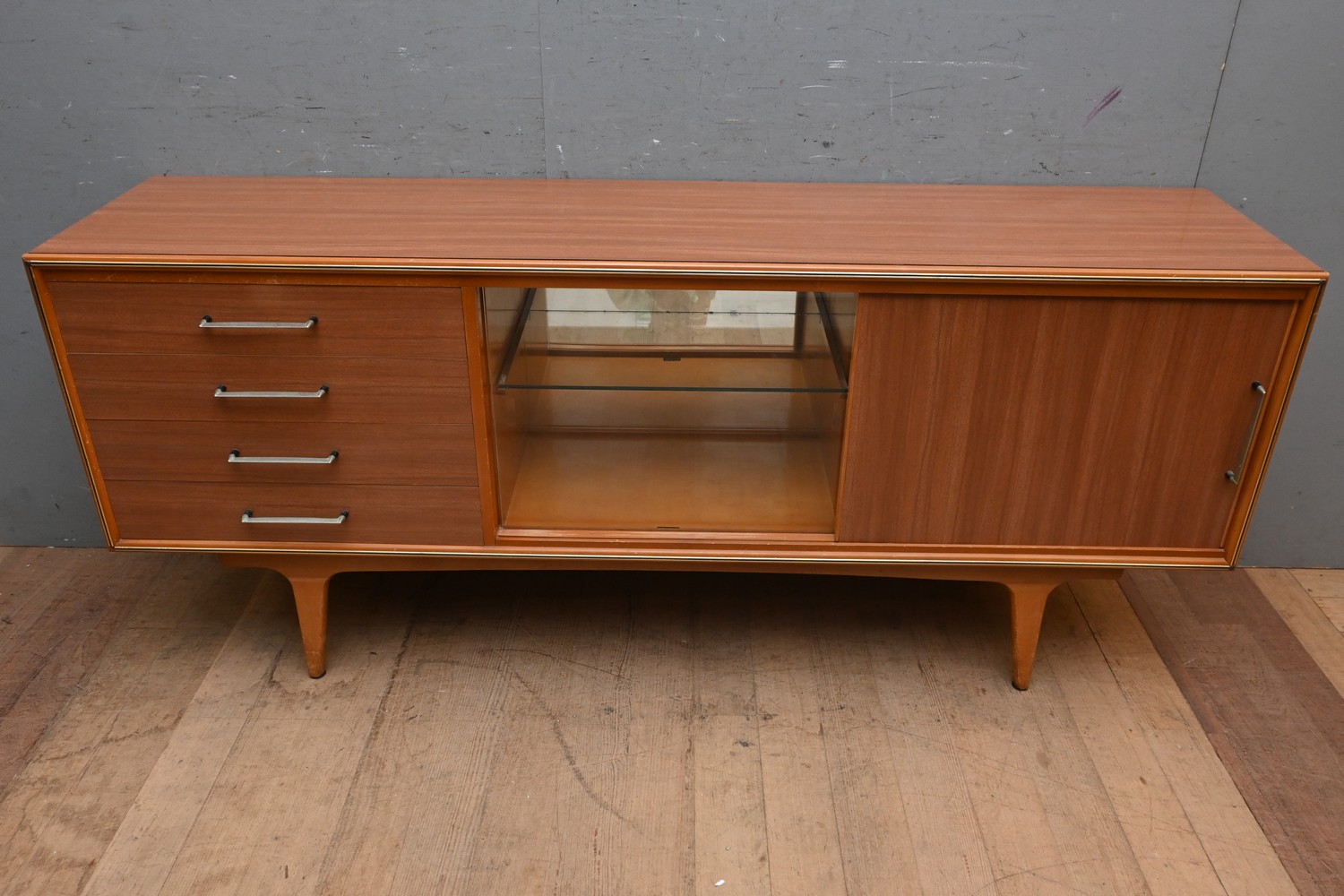 A MID CENTURY MODERNTONE SIDEBOARD WITH FOUR DRAWERS (A/F) (78H X 181W X 42D CM) (PLEASE NOTE THIS HEAVY ITEM MUST BE REMOVED BY CLIENTS OR CARRIERS AT THE CUSTOMERS EXPENSE. LEONARD JOEL STAFF CANNOT ASSIST CARRYING THIS ITEM)