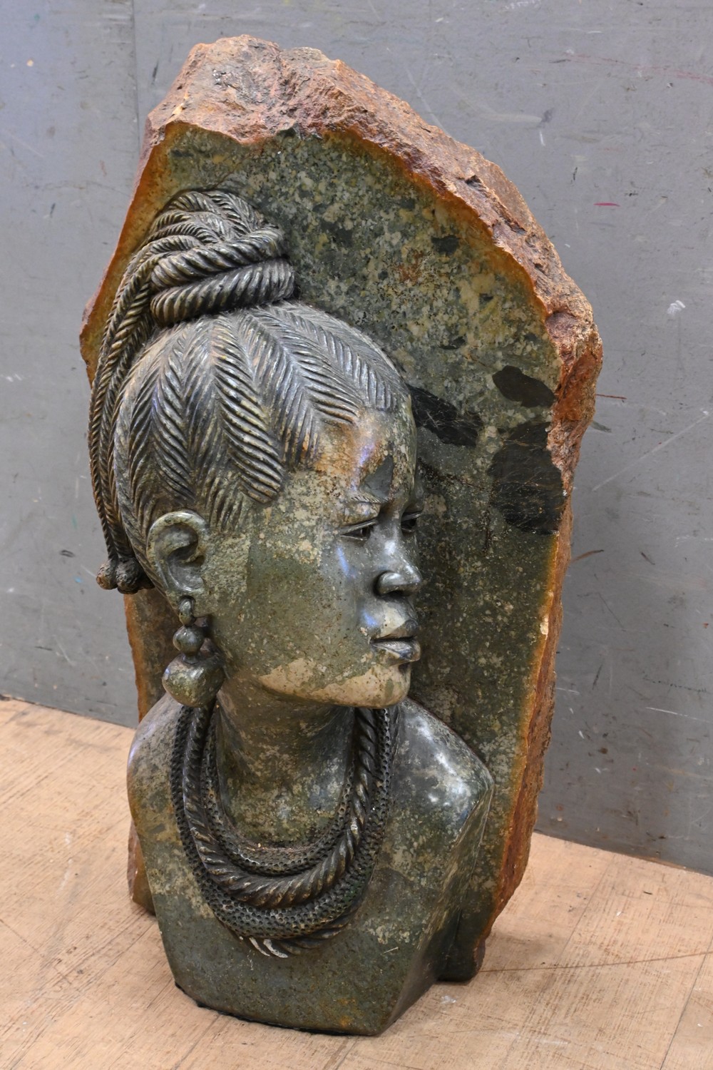 A HEAVY CARVED BELGIAN SOAPSTONE BUST FROM THE DEMOCRATIC REPUBLIC OF CONGO - SIGNS OF REPAIR (A/F) (74H X 40W X 23D CM) (PLEASE NOTE THIS HEAVY ITEM MUST BE REMOVED BY CLIENTS OR CARRIERS AT THE CUSTOMERS EXPENSE. LEONARD JOEL STAFF CANNOT ASSIST CARRYING THIS ITEM)
