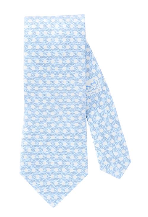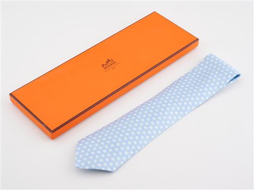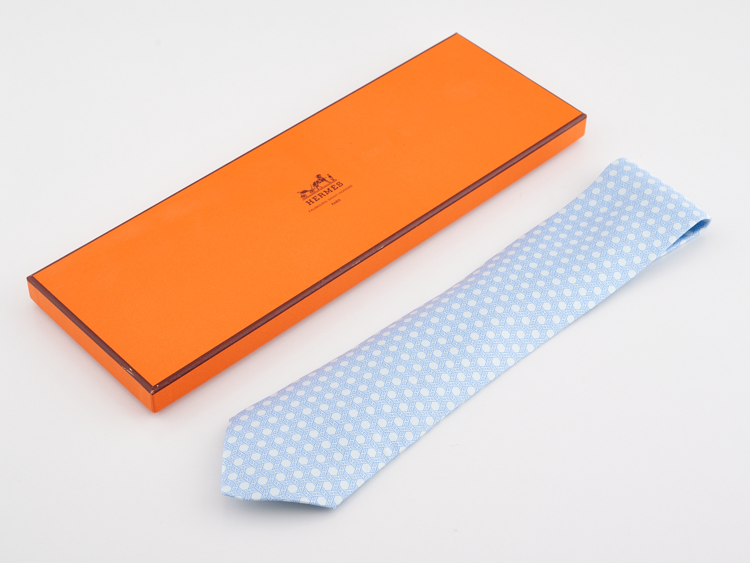 HERMÈS, SILK TIE - Styled with a blue interlocking 'H' design, boxed.