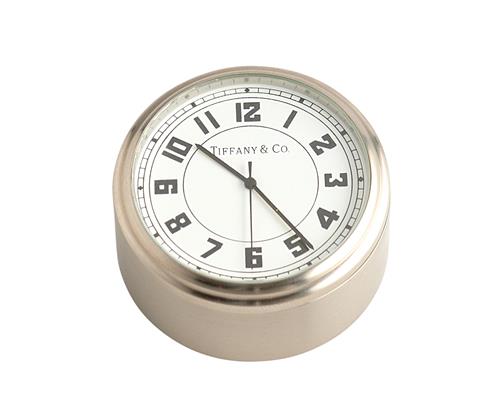A DESK CLOCK BY TIFFANY & CO., THE CIRCULAR WHITE DIAL WITH ROMAN NUMERALS TO A STAINLESS STEEL CASE, QUARTZ MOVEMENT, 45MM DIAMETER