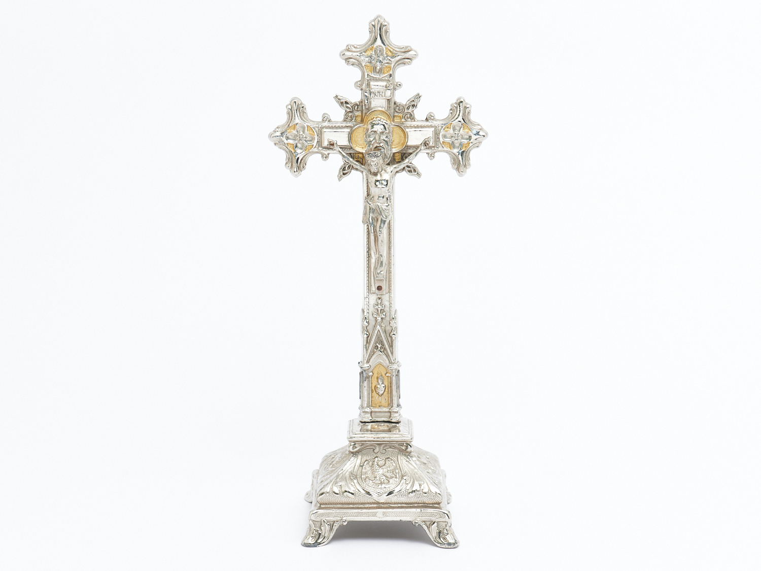 A FRENCH SILVERED METAL CRUCIFIX WITH CORPUS FIGURE AND GILT HIGHLIGHTS, H.40.5CM, LEONARD JOEL LOCAL DELIVERY: SMALL