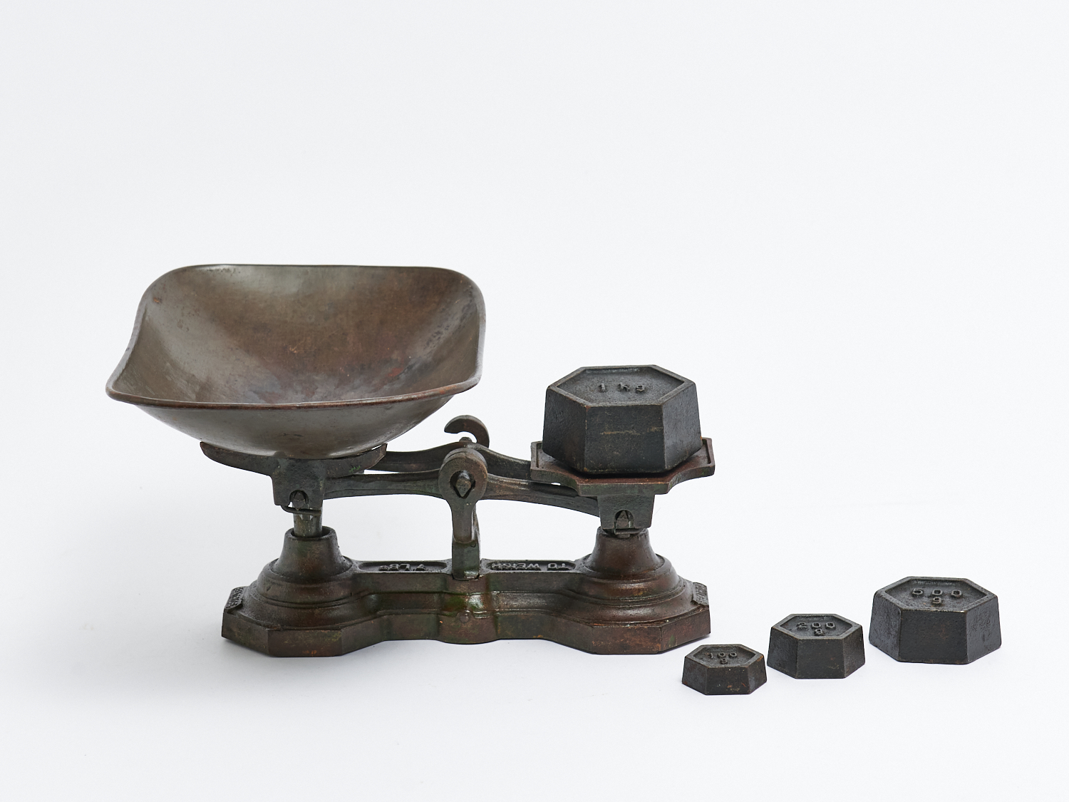A SET OF CAST-IRON-BASED KITCHEN SCALES WITH WEIGHTS, W.27CM, LEONARD JOEL LOCAL DELIVERY: MEDIUM