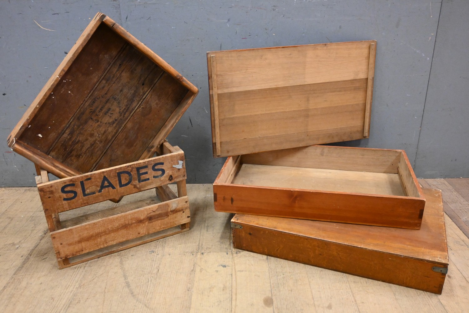 A COLLECTION OF FOUR VINTAGE TIMBER PIECES INCLUDING TWO ARTIST'S STORAGE BOXES, A "SLADES" BEVERAGE CRATE AND A SERVING TRAY ( 30H X 42W X 30D CM) (LEONARD JOEL DELIVERY SIZE: MEDIUM)