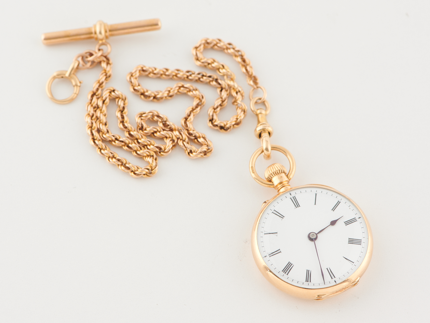A POCKET WATCH IN 18CT GOLD, TO FANCY ROPE LINK FOB CHAIN IN 18CT GOLD, SWISS HALLMARKS, THE POCKET WATCH WEIGHING APPROXIMATLEY 38.27GMS, THE FOB CHAIN WEIGHING APPROXIMATELY 23.67GMS, WITH VALUATION
