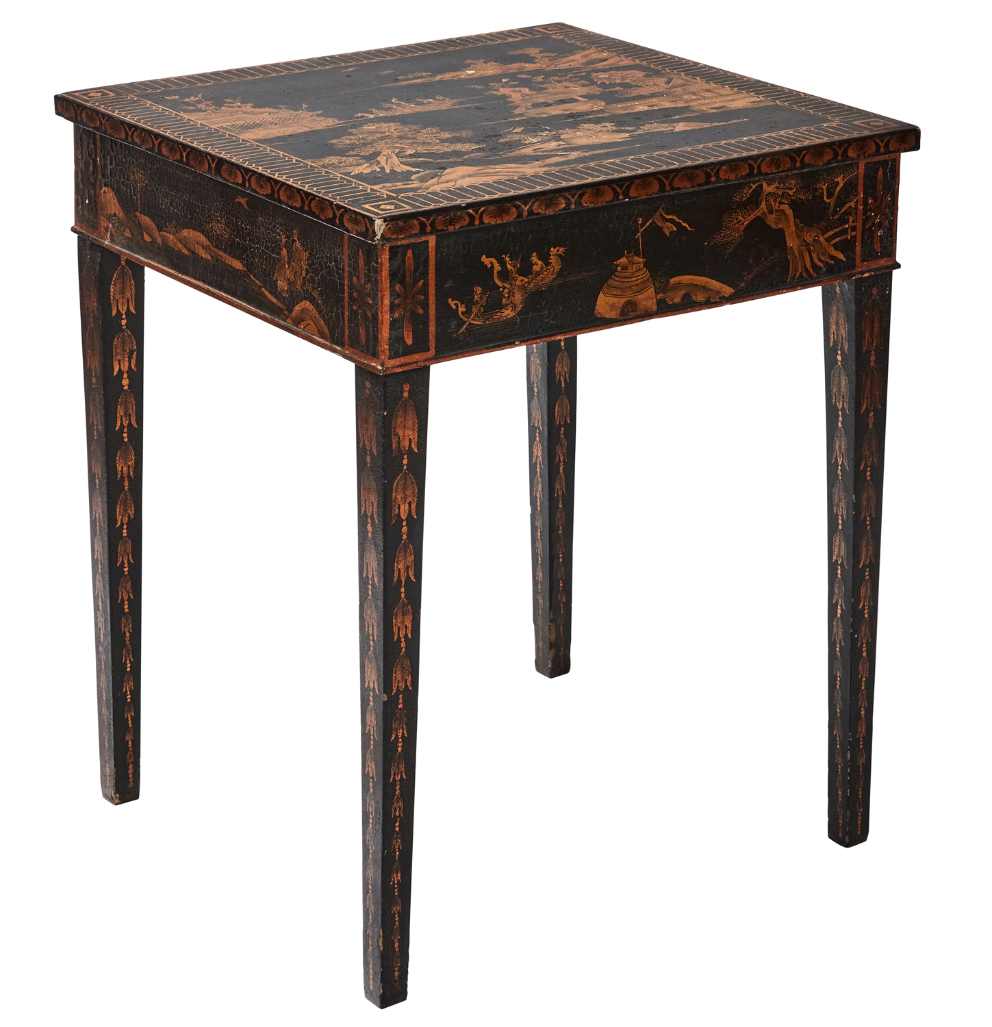The square top above a plain frieze on square tapering legs decorated all over with gold chinoiserie landscapes and figures.