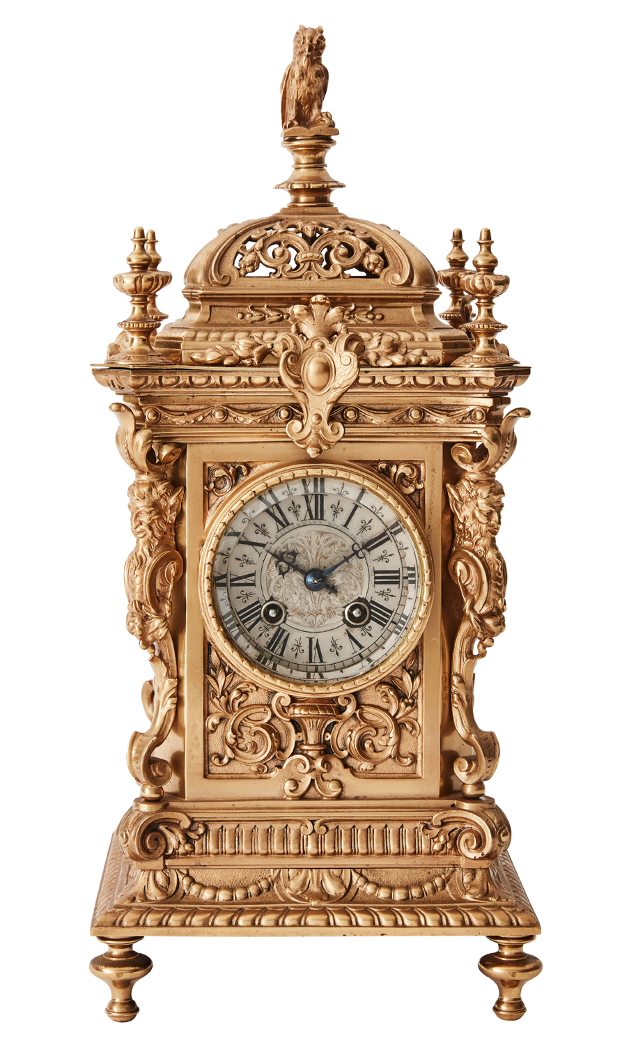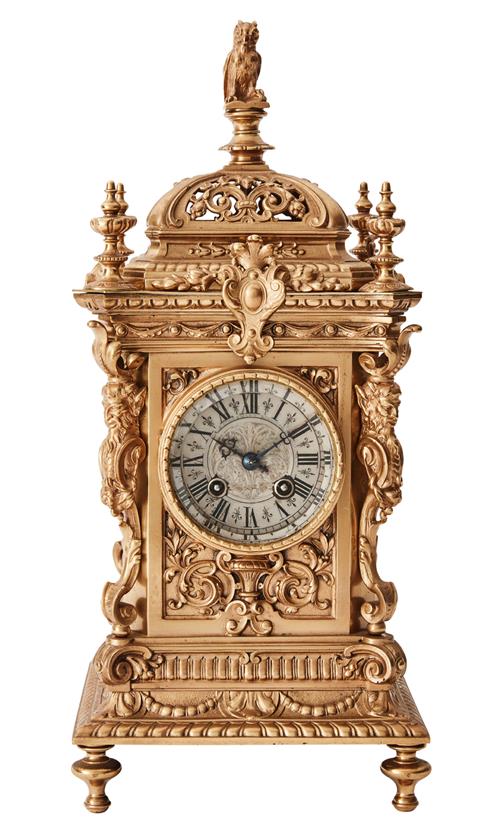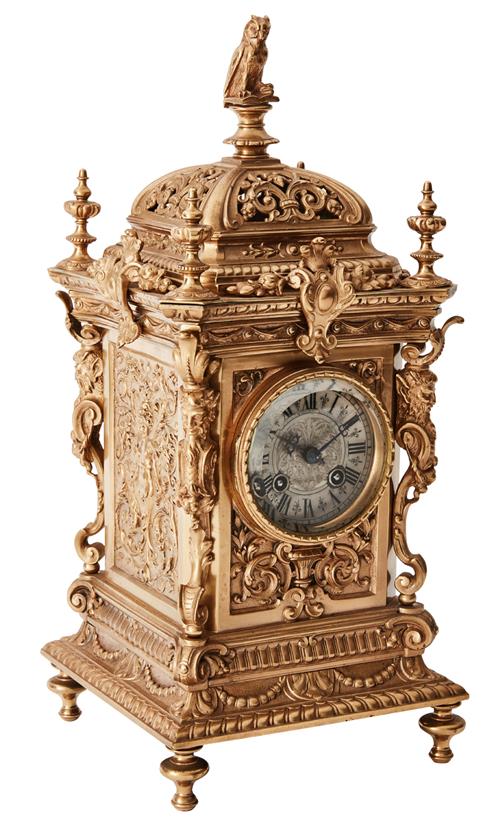Last quarter 19th century, in the renaissance revival style, surmounted by an owl above a pierced domed top, the silvered dial with Roman numerals flanked by scrolled herms, the movement by Gustave Becker.