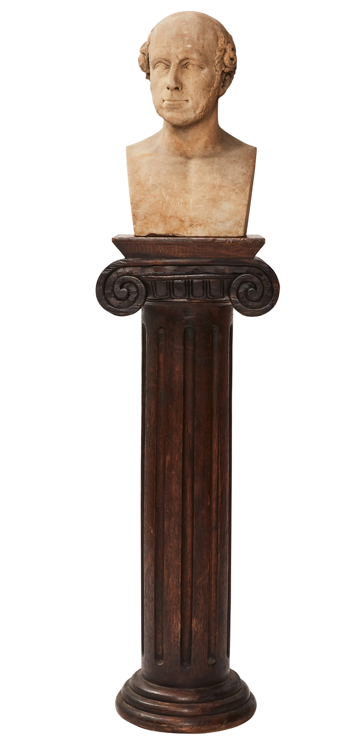 Signed verso: J Scholl, on a fluted oak ionic column pedestal.