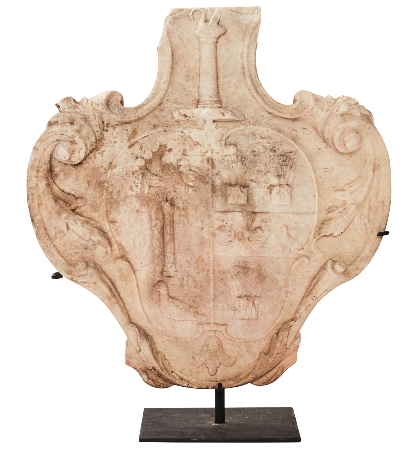 18th century, the scroll carved cartouche frame with a relief coat of arms of Kinder impaling Aldridge to the centre.