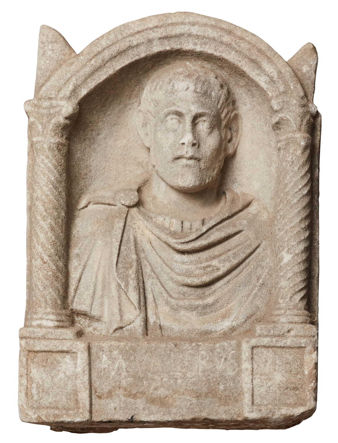 Circa 1st century C.E., of a soldier half-length wearing a cloak in an arched aedicule supported by spirally fluted columns with foliate capitals, incised: M. VALERUS / CUSTOS.