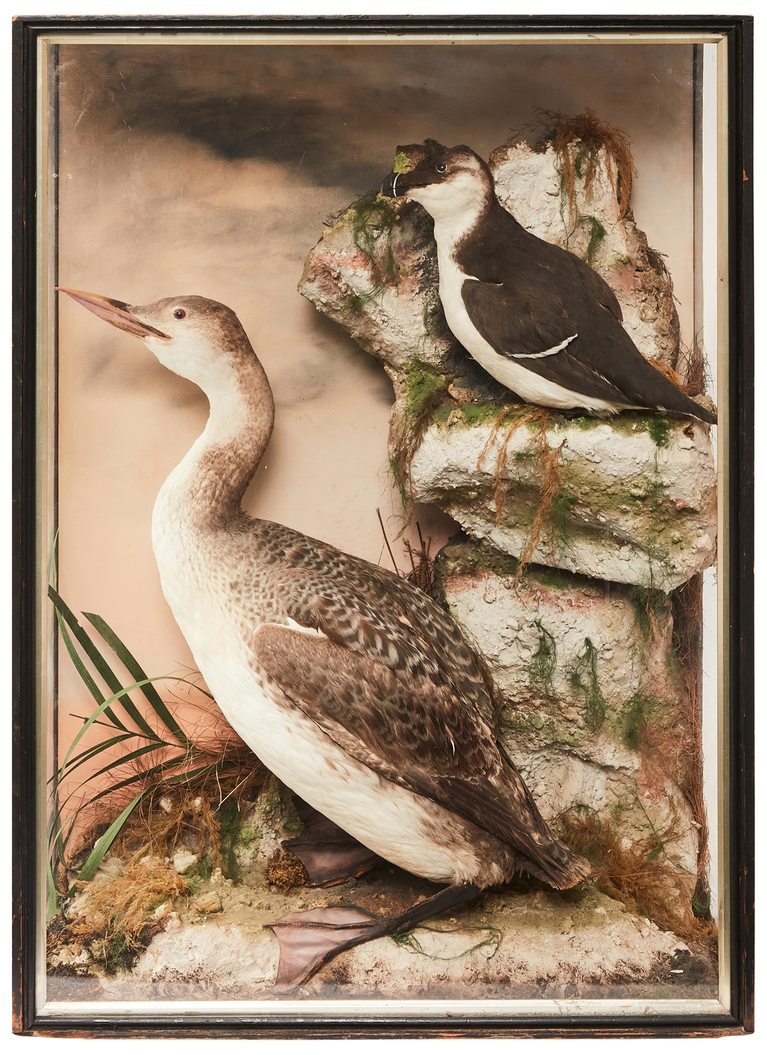 With a puffin on a piece of rock accompanied by a cormorant with weed and foliage against a painted background, maker's label verso.