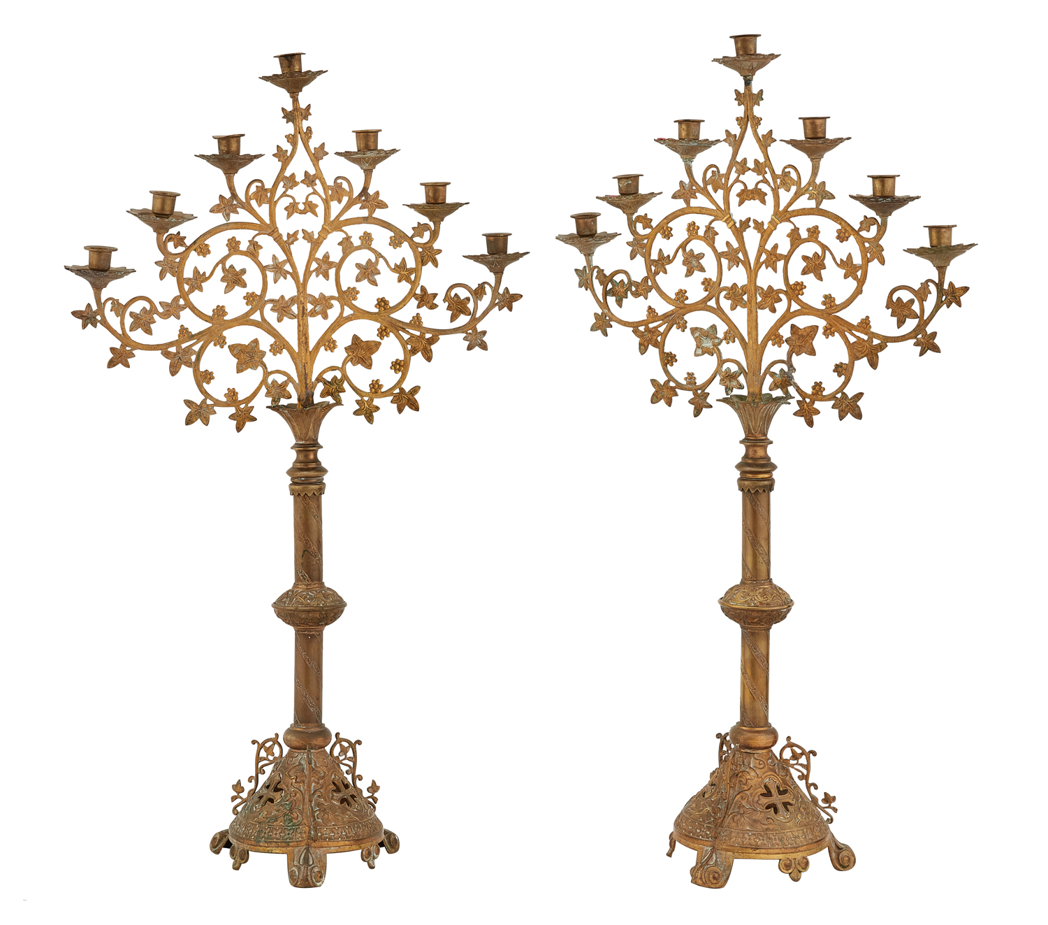 Late 19th century, in the gothic revival style, each on a conical base with scroll feet repousse vine leaves and pierced cross rising to a knopped shaft issuing scrolled fruiting vines supporting the candleholders.