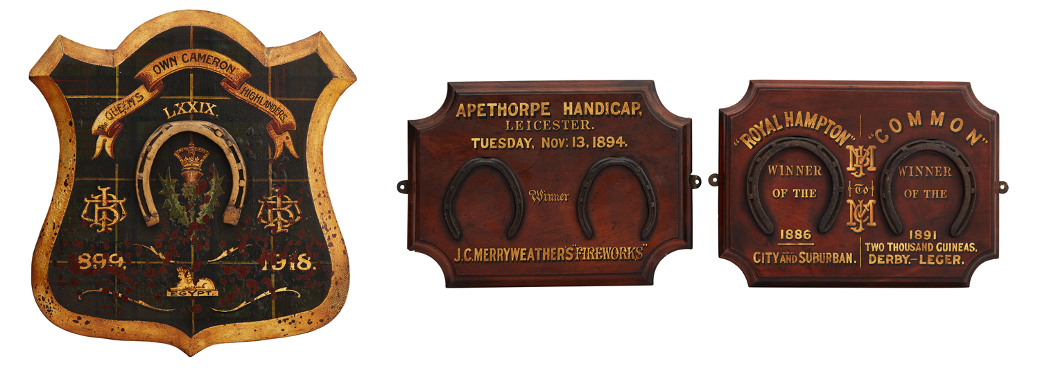 All set with horseshoes on shaped moulded mahogany panels with presentation inscriptions.