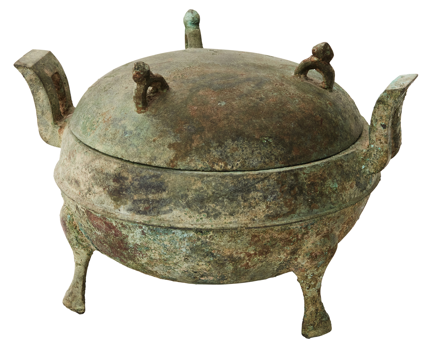 The flattened spherical body with a pair of flange handles, the cover with three ring handles, standing on short legs.