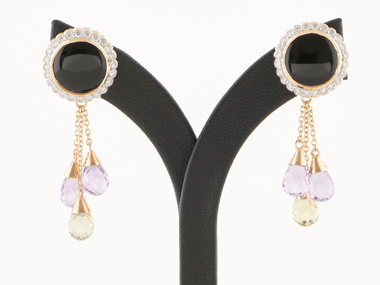 A PAIR OF ONYX, DIAMOND, AMETHYST AND CITRINE EARRINGS IN 14CT GOLD TO POST AND BUTTERFLY FITTINGS, 15 X 43MM, 6.6GMS