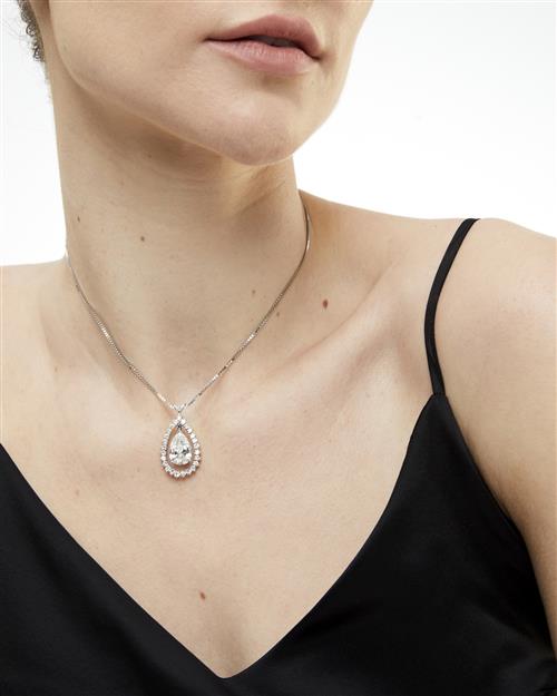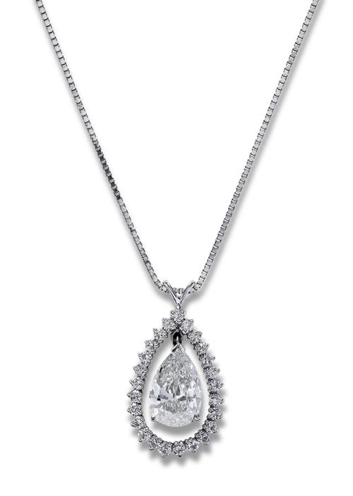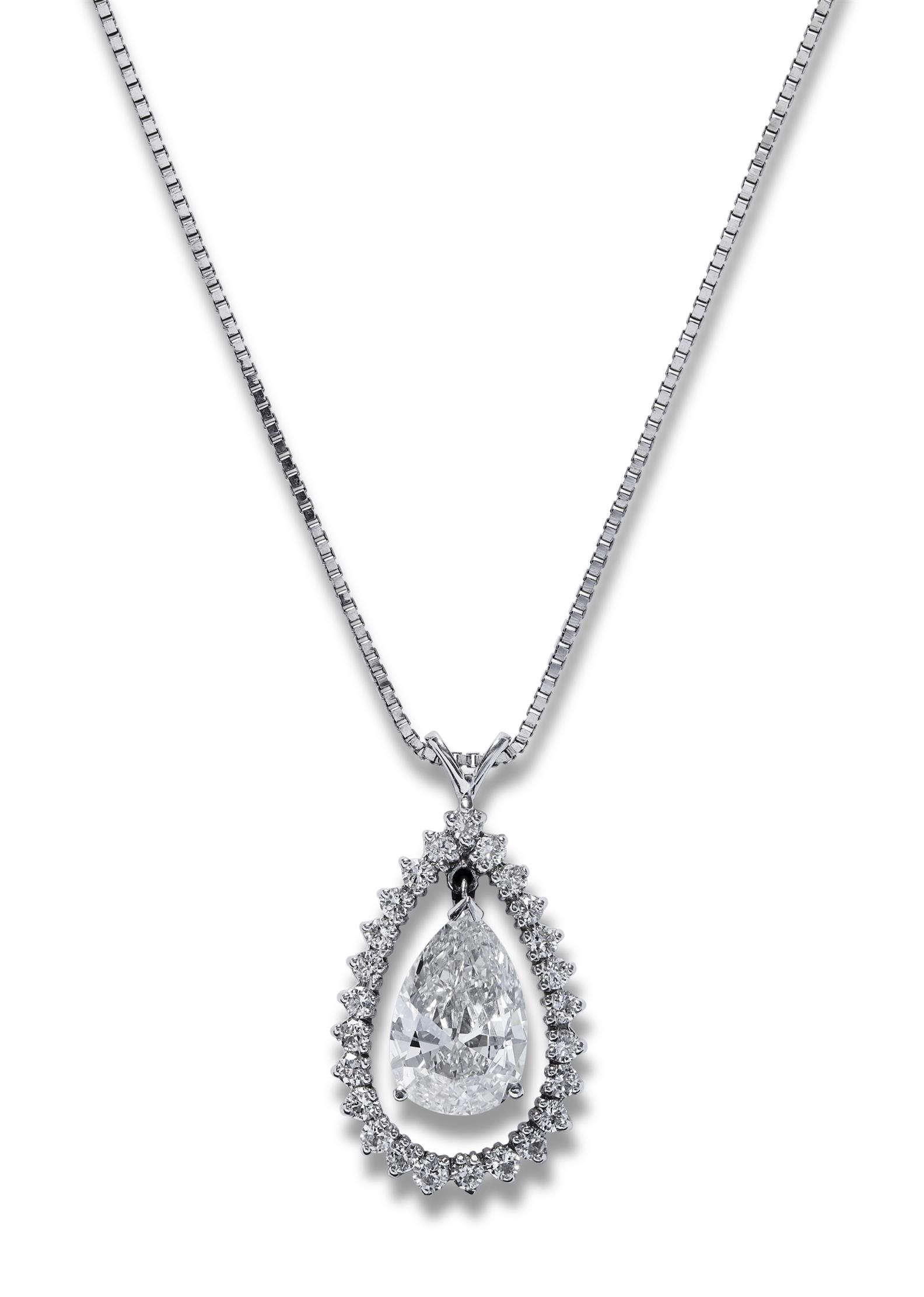 Terminating in an openwork drop-shaped plaque pavé-set with brilliant-cut diamonds supporting a claw-set pear-shaped diamond weighing 3.90 carats completed by a box link chain, the small diamonds together weighing approximately 1.00 carats, mounted in 18ct white gold, pendant length 32mm, circumference 400mm.