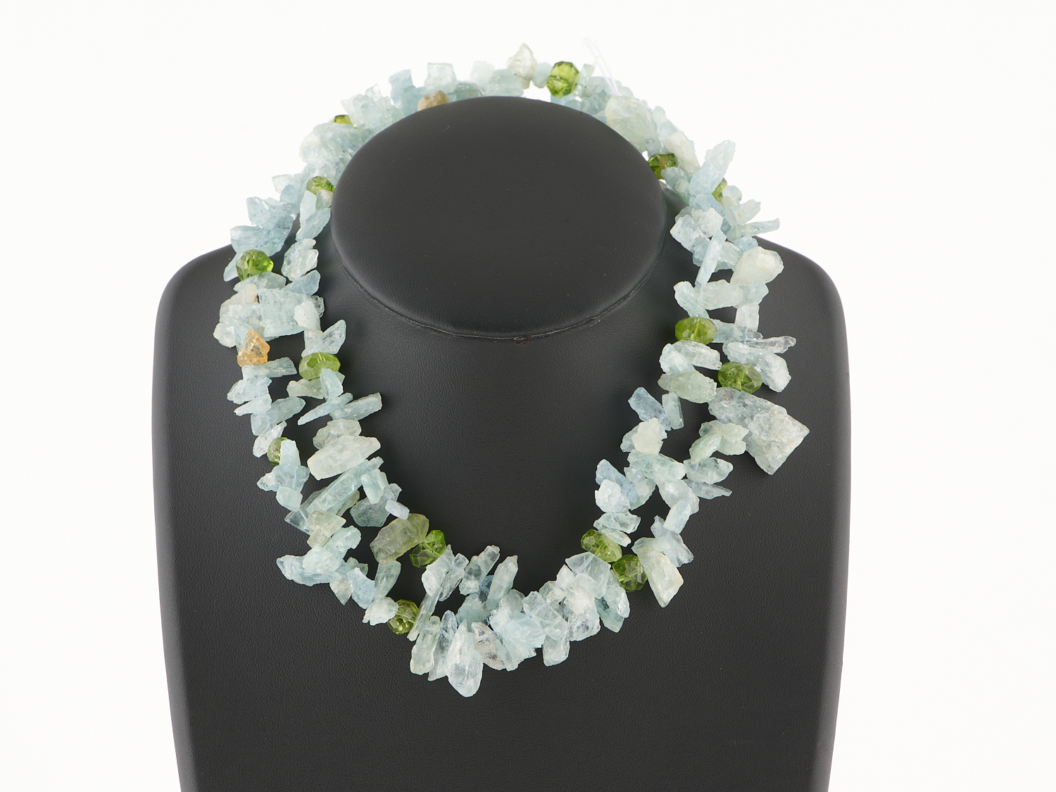 A LONG AQUAMARINE AND PERIDOT CHIP NECKLACE