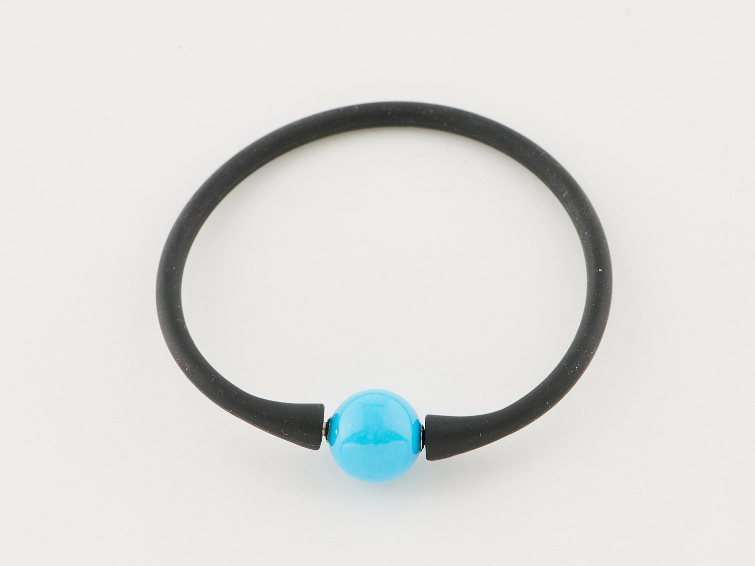 A SLEEPING BEAUTY MINED TURQUOISE STONE AND NEOPRENE BRACELET TO BAYONET CLASPS, TURQUOISE DIAMETER 14MM