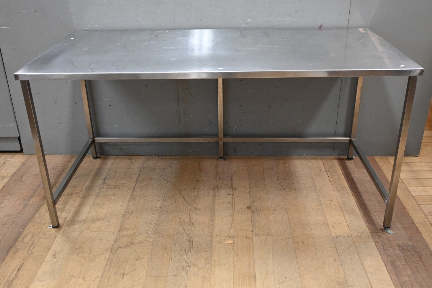A LARGE INDUSTRIAL STAINLESS STEEL PREPARATION TABLE (94H X 189W X 92D CM) (PLEASE NOTE THIS HEAVY ITEM MUST BE REMOVED BY CLIENTS OR CARRIERS AT THE CUSTOMERS EXPENSE. LEONARD JOEL STAFF CANNOT ASSIST CARRYING THIS ITEM)