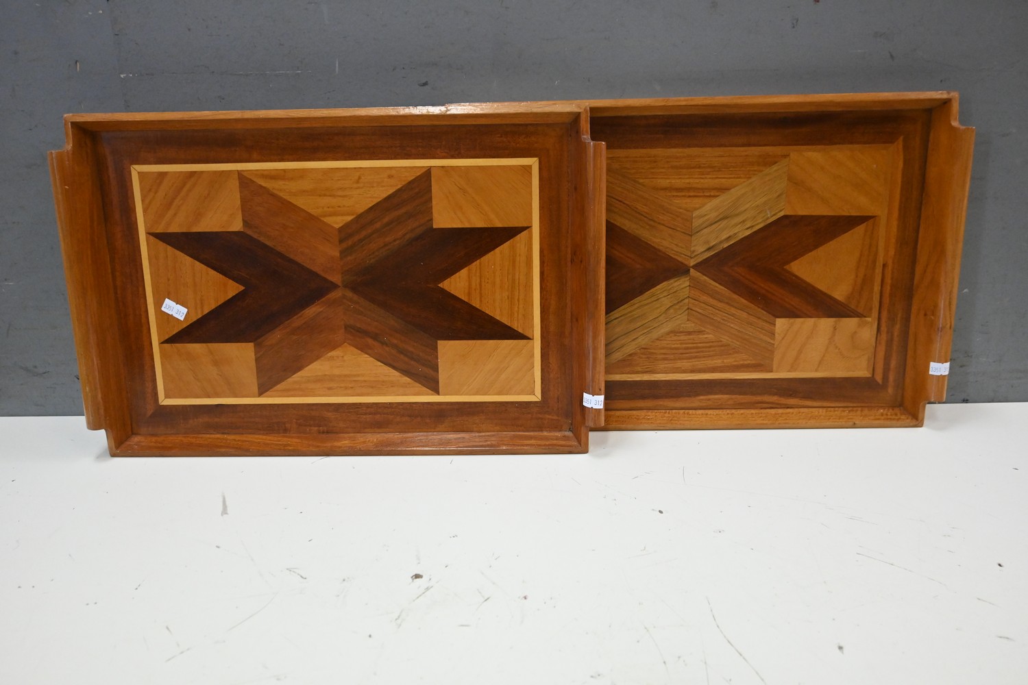 A PAIR OF MID CENTURY SCANDINAVIAN MARQUETRY TEAK TRAYS (33H X 49D CM) (LEONARD JOEL DELIVERY SIZE: SMALL)