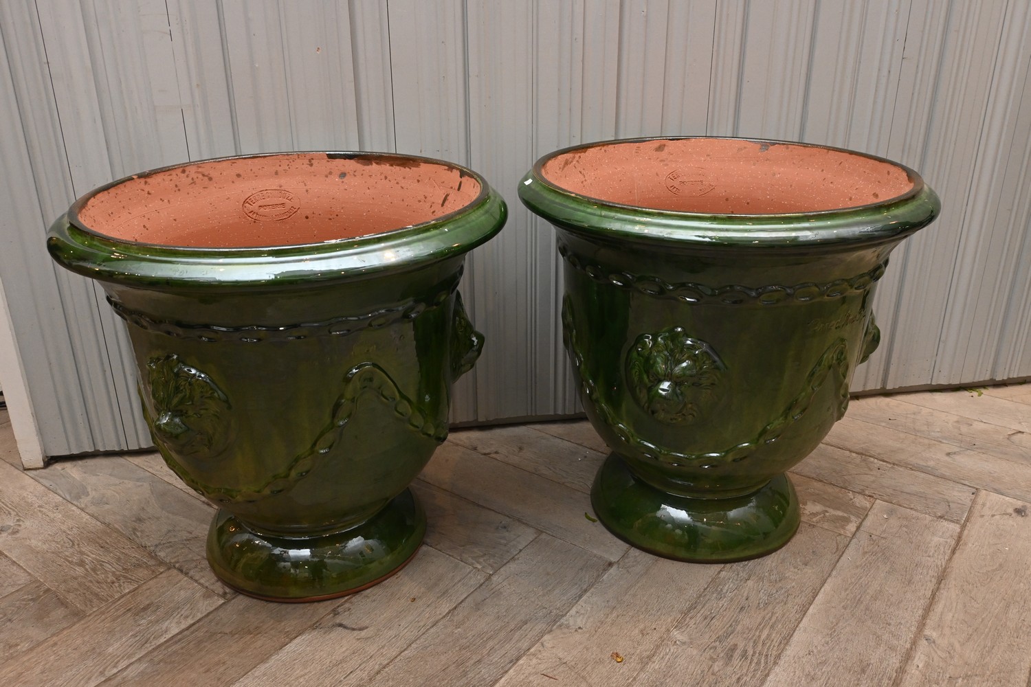 A PAIR OF FRENCH ANDUZE URNS (63H X 68D CM) (PLEASE NOTE THIS HEAVY ITEM MUST BE REMOVED BY CLIENTS OR CARRIERS AT THE CUSTOMERS EXPENSE. LEONARD JOEL STAFF CANNOT ASSIST CARRYING THIS ITEM)