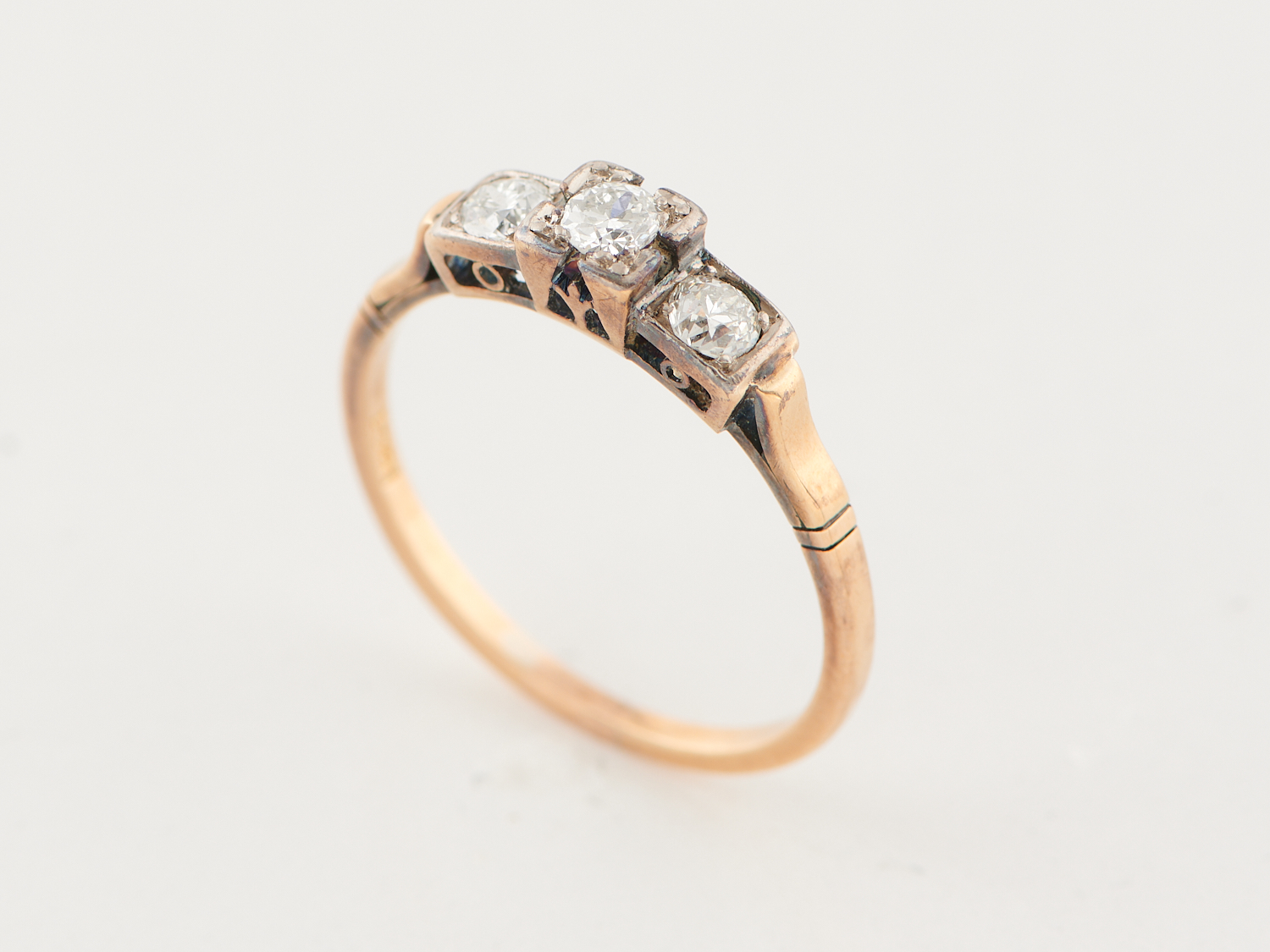 A THREE STONE DIAMOND RING IN 18CT GOLD, RING SIZE S, 3.25GMS