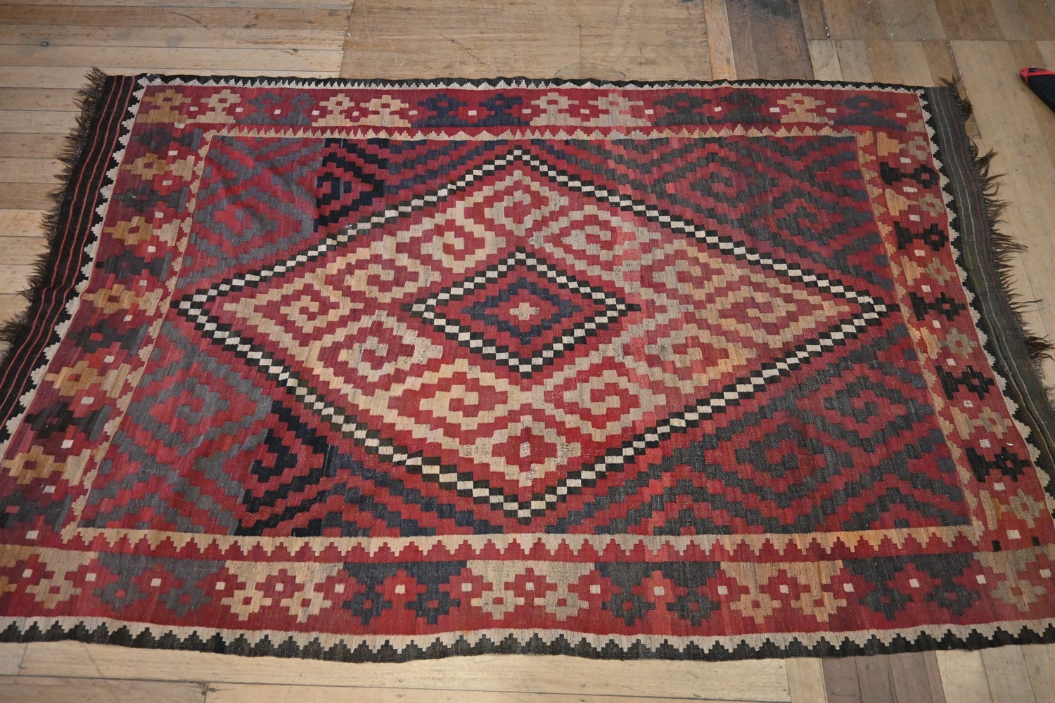 A VINTAGE 100% WOOL HAND LOOMED KILIM RUG MADE IN AFGHANISTAN (A/F) (317 X 196 CM) (LEONARD JOEL DELIVERY SIZE: MEDIUM)