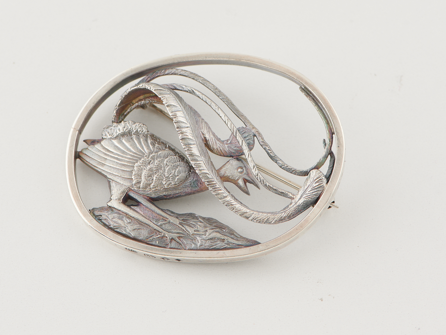 A LYRE BIRD BROOCH BY TONY KEAN IN STERLING SILVER, SIZE 35 X 45MM, APPROXIMATE WEIGHT 16.26GMS