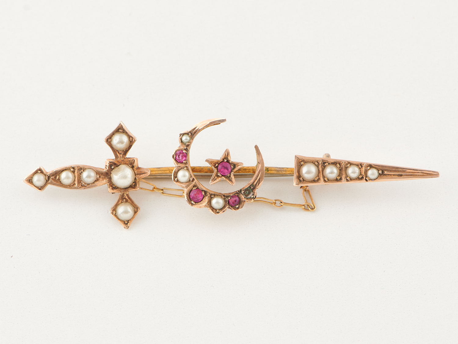 A RUBY AND SEED PEARL SET BROOCH IN 9CT GOLD, PIN IN BASE METAL, LENGTH 70MM, 3.9GMS