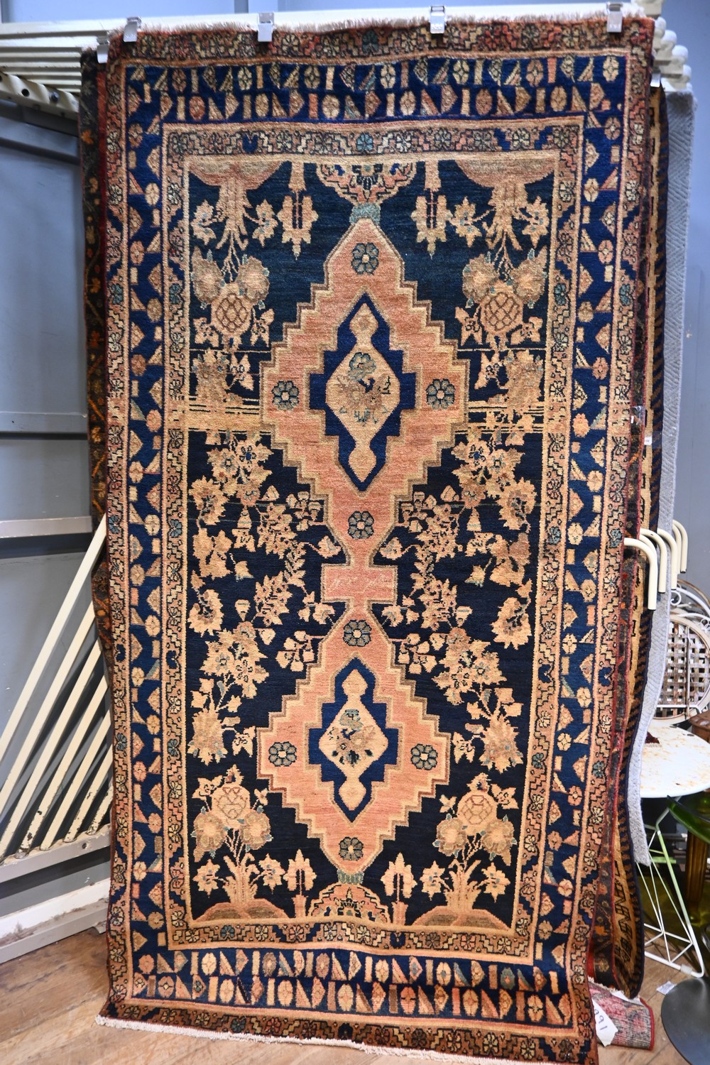A PERSIAN CIRCA 1970'S NAHAVAND RUG. 100% WOOL, NATURAL DYES, VINTAGE PILE. HAND-KNOTTED WEAVE WITH DESIGN OF DOUBLE ANCHORED DIAMOND MEDALLIONS ON A CHARCOAL FIELD SET WITHIN A FIELD OF VARYING FLORAL SPRAYS AND VASES. BORDER OF TRIBAL AND ROSETTES MOTIFS. SOFT MELLOW TONES ALL OVER. RESTORED TO GALLERY CONDITION. SIZE: 260 X 132 CM ORIGIN: PERSIA - RRP: $2,700 DOCUMENTATION OF AUTHENTICITY INCLUDED.