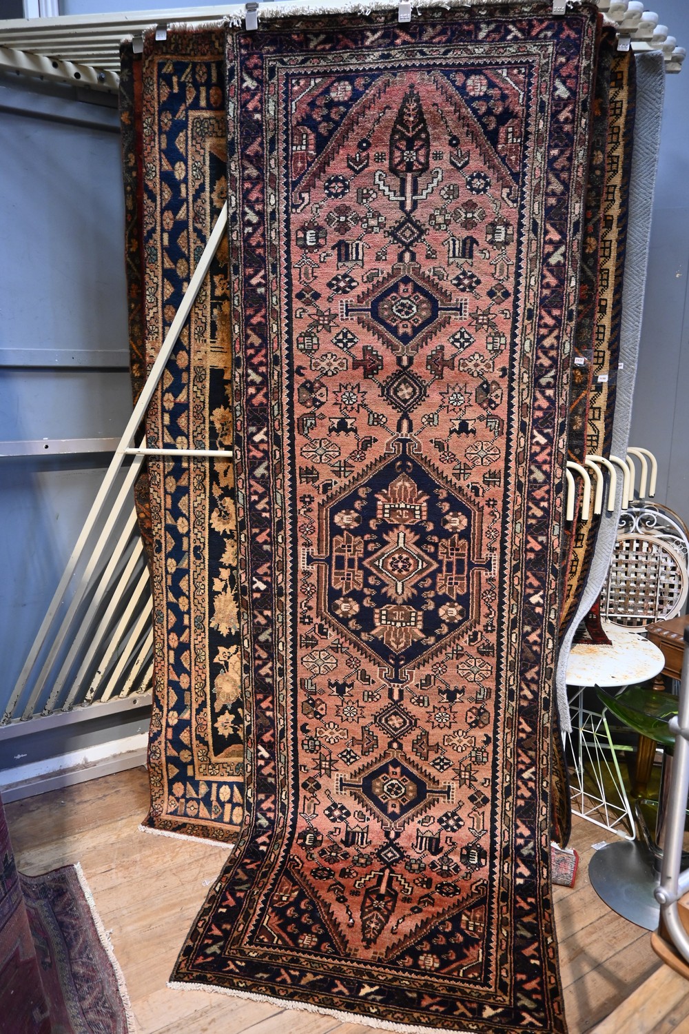 A PERSIAN HAMADAN HALL RUNNER. 100% WOOL, NATURAL DYES, SEMI VINTAGE PILE. HAND-KNOTTED HAMADAN VILLAGE WEAVE WITH DESIGN OF TRIPLE ELONGATED MEDALLIONS ON A FIELD OF TRIBAL MOTIFS AND ROSETTES SET WITHIN A SOFT RED FIELD. BORDER OF TRIBAL MOTIFS. SIZE: 305 X 100 CM ORIGIN: PERSIA - RRP: $1,900 DOCUMENTATION OF AUTHENTICITY INCLUDED.