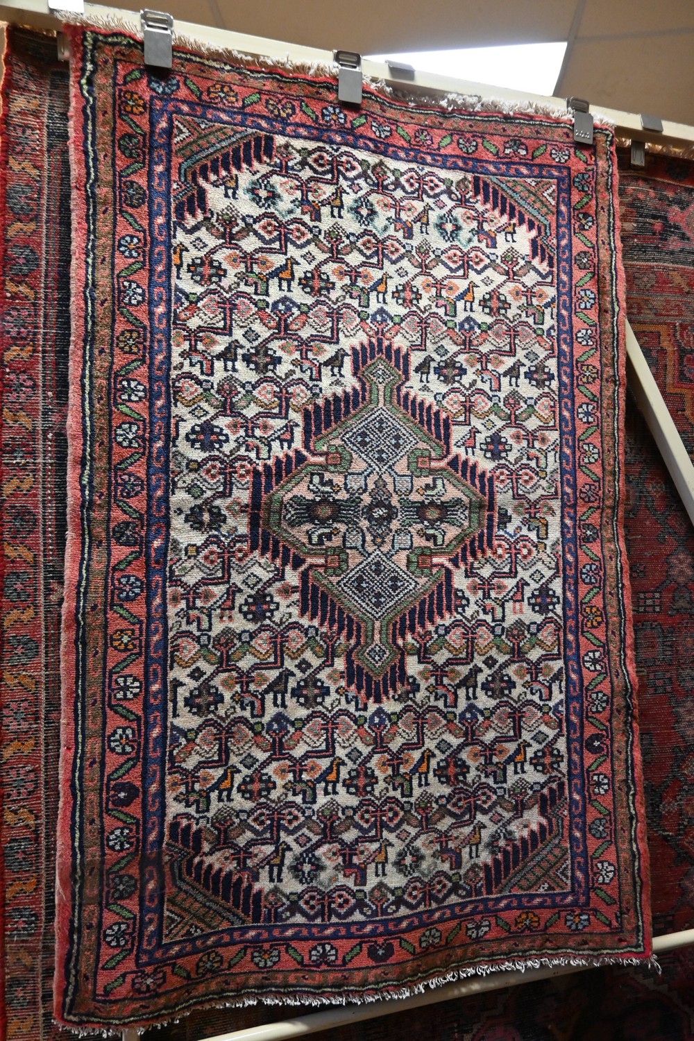 A FINE PERSIAN MIR SERABAND RUG, 100% WOOL PILE. SOLID & HARD-WEARING. HAND-KNOTTED VILLAGE WEAVE WITH A DESIGN OF TRIPLE DIAMOND-SHAPED MEDALLION CONTAINING MOTIFS SET WITHIN A FIELD OF PAISLEY PATTERNS. BORDER OF SERABAND. SIZE: 116 X 77 CM ORIGIN: PERSIA - RRP: $690 DOCUMENTATION OF AUTHENTICITY INCLUDED.