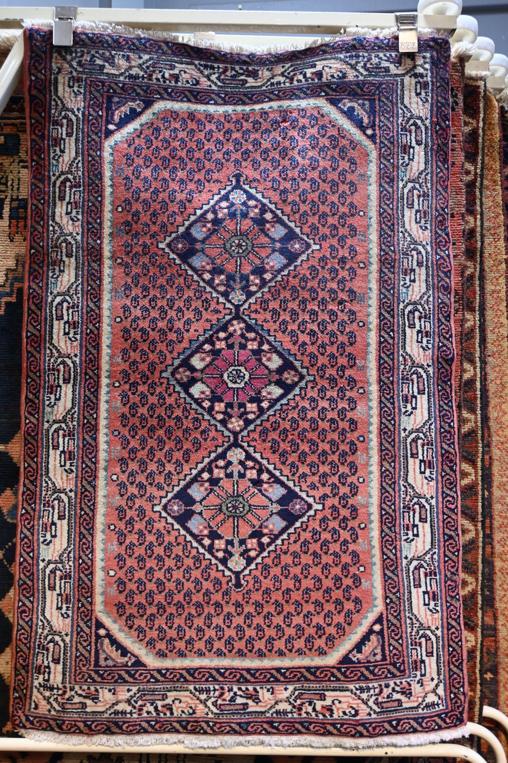 A FINE PERSIAN RUDBAR RUG. 100% WOOL, NATURAL DYES. GLOSSY SHEEN TO THE RUG. CENTRAL MEDALLION ON A CREAM FILED OF GEOMETRIC, FLORAL AND BIRD MOTIFS. BORDER OF ROSETTES AND TRIBAL MOTIFS. SIZE: 115 X 77 CM ORIGIN: PERSIA - RRP: $600 DOCUMENTATION OF AUTHENTICITY INCLUDED
